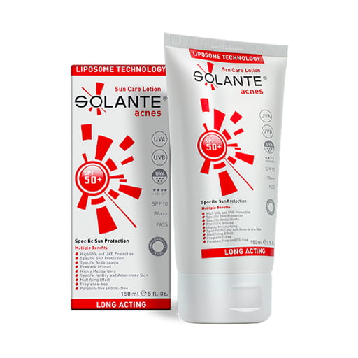 Solante Acnes SPF 50+ Losyon, Bu özel güneş koruyucu, yağlı ve akneye eğilimli ciltleri güneşin zararlı ışınlarından (UVA/UVB) yüksek düzeyde korurken, özel içeriği ile cilt sağlığının korunmasına, cildin sağlıklı ve pürüzsüz bir görünüm kazanmasına yardımcı olur.