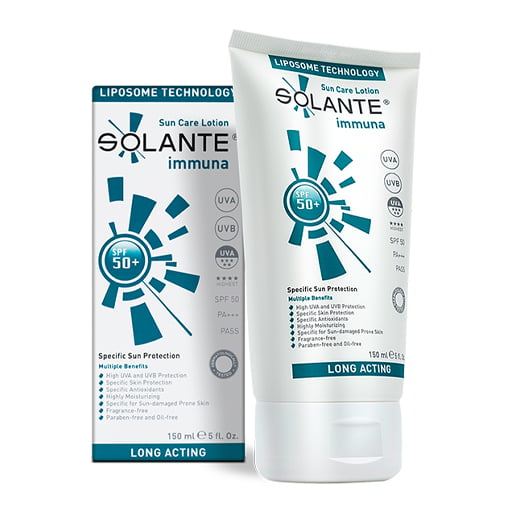 Solante Immuna SPF 50+ Losyon, Bu özel güneş koruyucu, güneşin cilt hasarlarına neden olan zararlı ışınlarına (UVA/UVB) karşı yüksek düzeyde güneşten koruyucu etki sağlar. Cilt hasarına yatkın, hassas ve reaktif ciltleri güneşin zararlı ışınlarına karşı derinlemesine korumak ve güneşin cilt üzerinde neden olduğu yaşlanma etkilerini geciktirmek amacıyla özel olarak geliştirilmiştir.