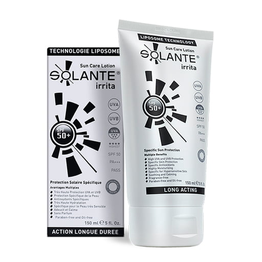 Solante Irrita SPF 50+ Losyon, Bu özel güneş koruyucu, güneşin cilt hasarlarına neden olan zararlı ışınlarına (UVA/UVB) karşı yüksek düzeyde güneşten koruyucu etki sağlarken dermatolojik ve kozmetik uygulamalar, mekanik veya kimyasal tahrişler, peeling, cilt gençleştirme uygulamaları sonrasında tahriş olmuş cildin rahatlatılmasına ve yatıştırılmasına da yardımcı olur.
